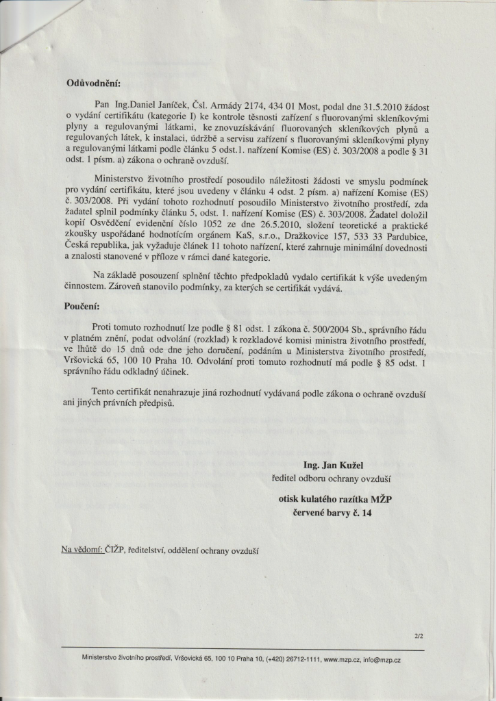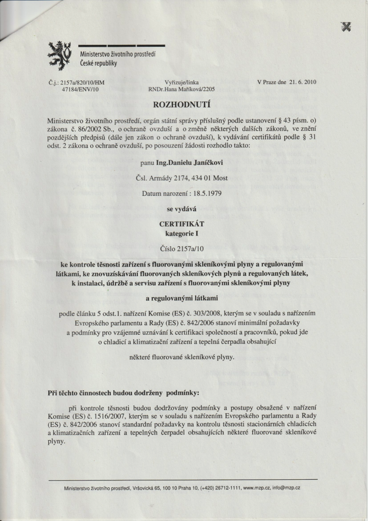 Oprávnění Ministerstva ŽP ČR – Certifikát kategorie I