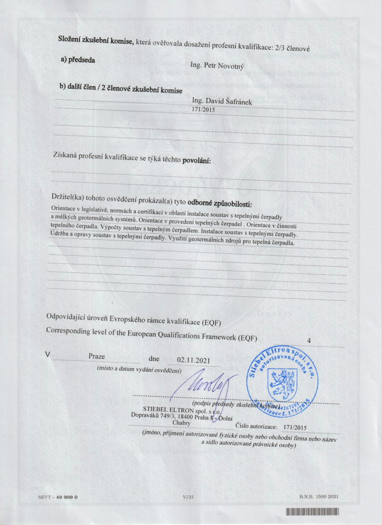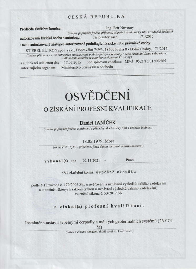 Osvědčení o získání profesní kvalifikace – Instalatér soustav s tepelnými čerpadly